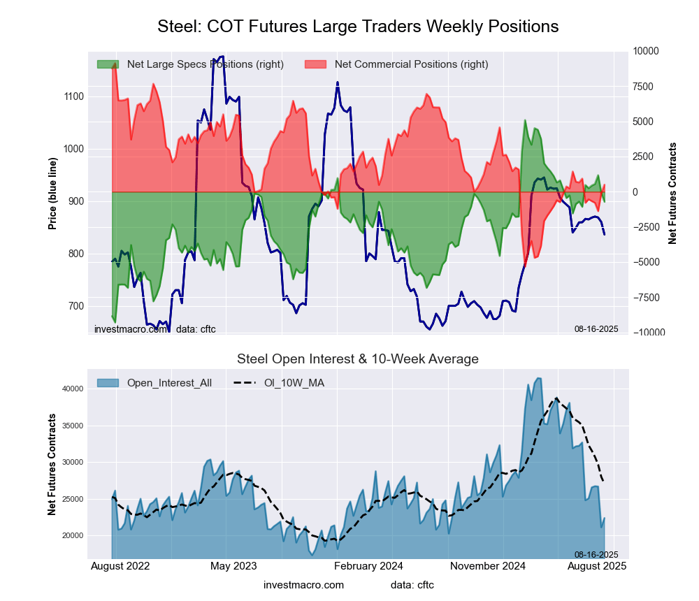 Steel Futures COT ChartThe Steel Futures large speculator standing this week was a net position of -718 contracts in the data reported through Tuesday. This was a weekly fall of -626 contracts from the previous week which had a total of -92 net contracts.
