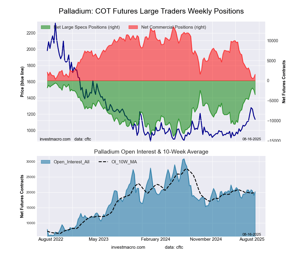 Palladium Futures COT ChartThe Palladium Futures large speculator standing this week was a net position of -3,496 contracts in the data reported through Tuesday. This was a weekly fall of -1,161 contracts from the previous week which had a total of -2,335 net contracts.