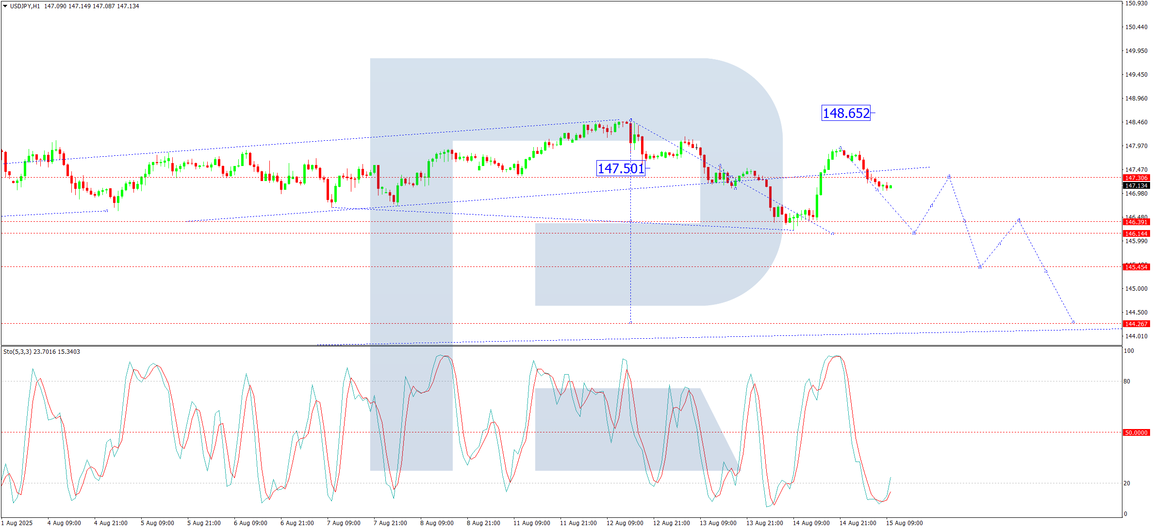 On the H1 chart, the pair is forming a descending wave structure, targeting 146.16. A corrective bounce to 147.30 may follow before the downtrend potentially resumes towards 145.45. The Stochastic oscillator reinforces this view, with its signal line below 50 and trending firmly downward.