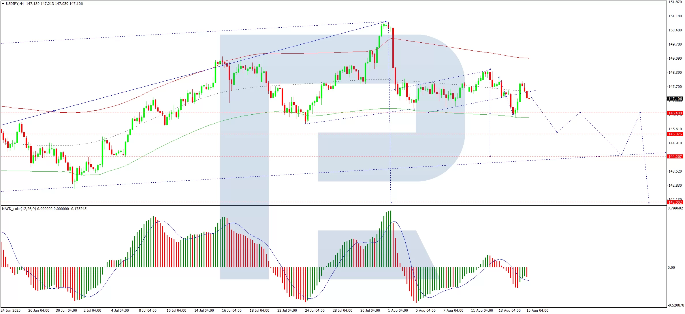 On the H4 chart, USD/JPY continues its downward trajectory, eyeing 146.14—a level likely to be tested today. A rebound to 147.30 is possible before another decline towards 145.45, with further downside potential to 144.30. This scenario is supported by the MACD indicator, where the signal line remains below zero and pointing sharply downward.