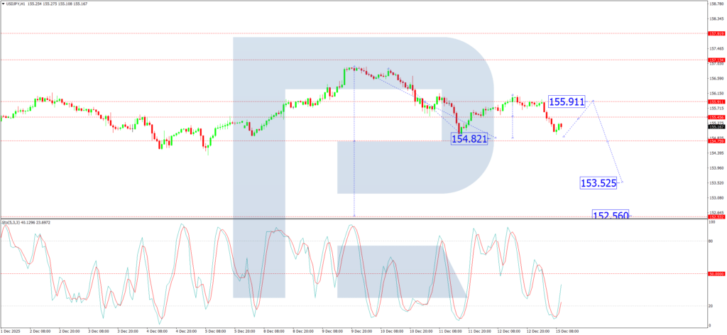 On the H1 chart, the pair is forming a declining wave with an immediate target at 154.82. Upon reaching this level, a corrective upward move towards 155.45 is anticipated. A further extension of this correction to 155.91 cannot be ruled out. However, following this relief rally, we expect the primary downtrend to resume, driving the pair lower towards 153.52. The Stochastic Oscillator aligns with this near-term corrective view, as its signal line has turned up from the 20 level and is rising towards 50, indicating that a temporary bounce is likely before selling pressure reasserts itself.