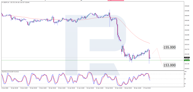 On the H1 chart, USD/JPY is testing the 153.80 mark and forming a growth wave. If the price tests the 155.00 level and rebounds, further declines could be expected, with the first support at 153.00 USD. The Stochastic oscillator supports this, as its signal lines continue to decline towards the 50.0 level. A break of this level would signal a continuation of the downward trend.