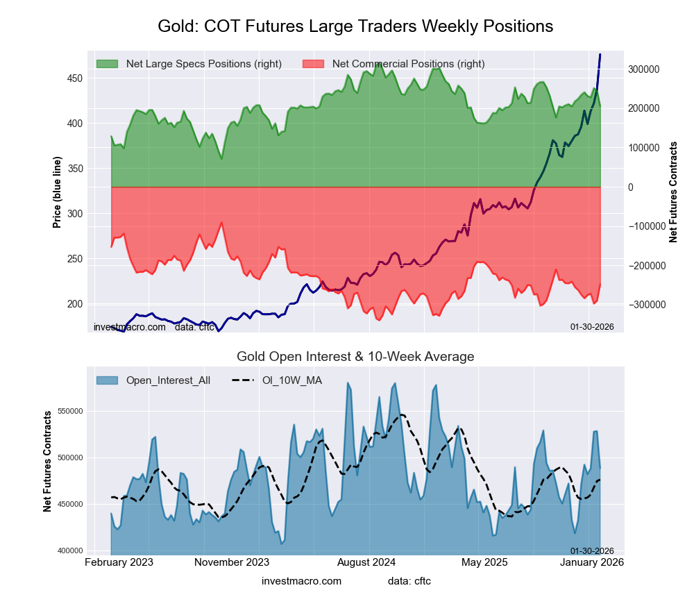 The latest COT data is updated through Tuesday January 27th and shows a quick view of how large traders (for-profit speculators and commercial entities) were positioned in the futures markets.