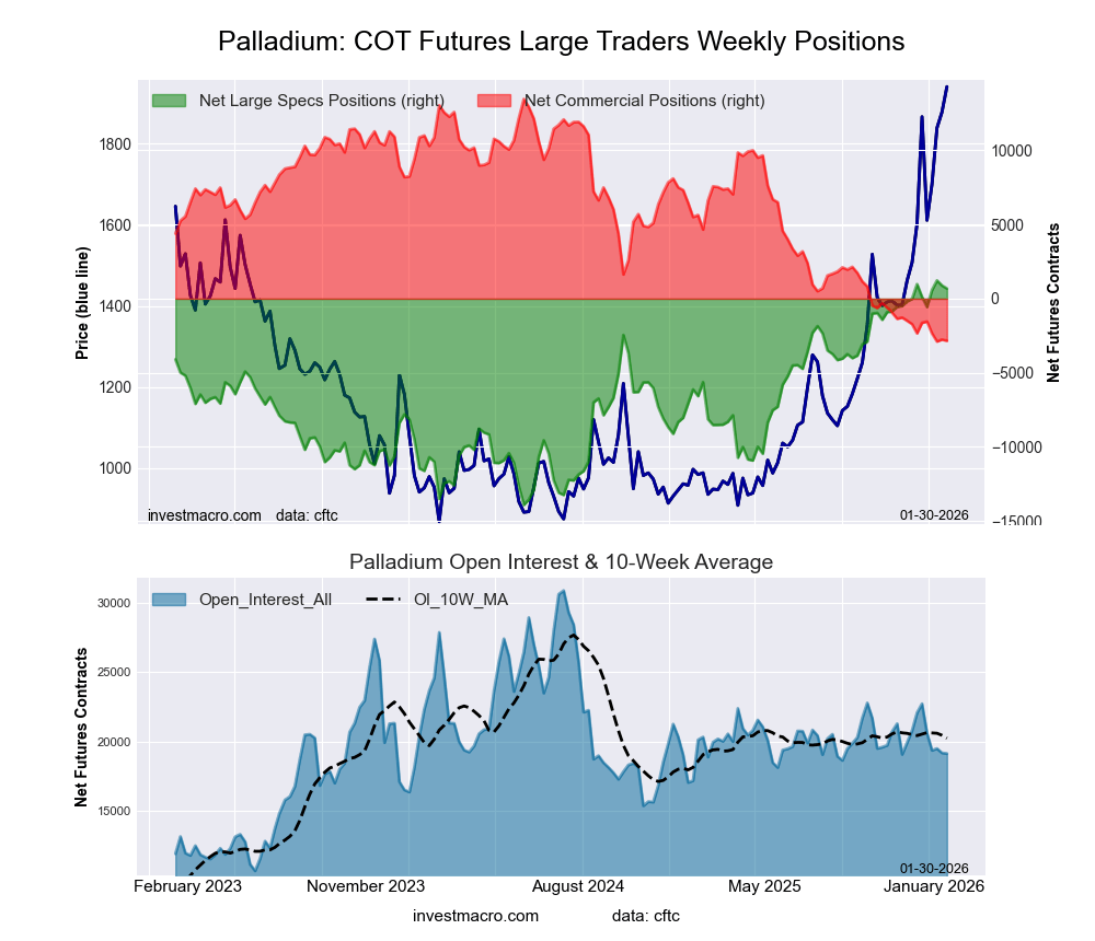 The Platinum Futures large speculator standing this week resulted in a net position of 13,922 contracts in the data reported through Tuesday. This was a weekly decline of -1,202 contracts from the previous week which had a total of 15,124 net contracts.