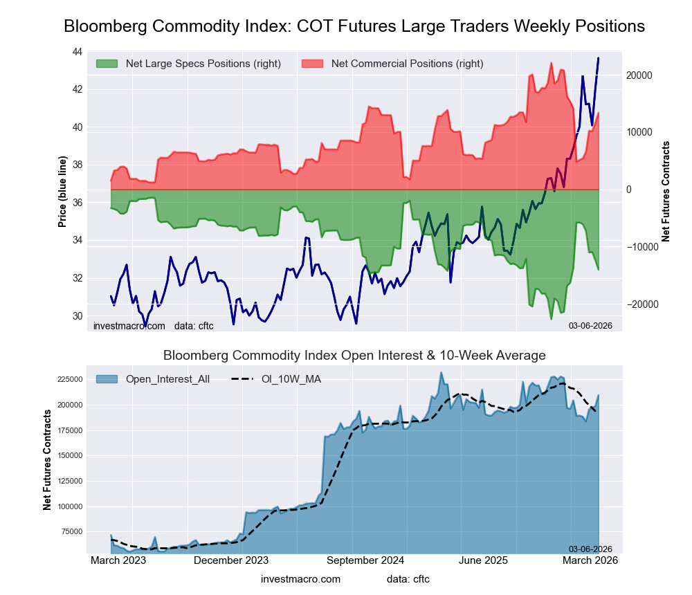 The Bloomberg Commodity Index Futures large speculator standing this week reached a net position of -14,034 contracts in the data reported through Tuesday. This was a weekly reduction of -1,650 contracts from the previous week which had a total of -12,384 net contracts.