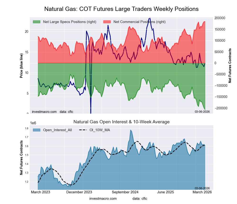 The Natural Gas Futures large speculator standing this week reached a net position of -206,422 contracts in the data reported through Tuesday. This was a weekly decline of -7,903 contracts from the previous week which had a total of -198,519 net contracts.