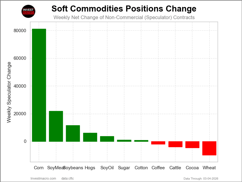 Leading the gains for the softs markets was Corn (81,231 contracts) with Soybean Meal (21,920 contracts), Soybeans (11,630 contracts), Lean Hogs (6,052 contracts), Soybean Oil (3,752 contracts), Sugar (1,089 contracts) and Cotton (873 contracts) also showing positive weeks.