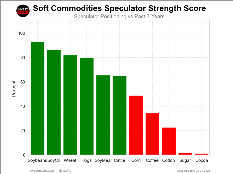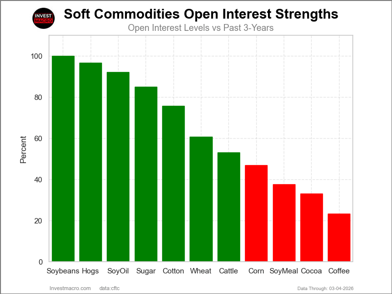 COT Strength Scores (a normalized measure of Speculator positions over a 3-Year range, from 0 to 100 where above 80 is Extreme-Bullish and below 20 is Extreme-Bearish) showed that Soybeans (93 percent) and Soybean Oil (86 percent) lead the softs markets this week. Wheat (82 percent), Lean Hogs (80 percent) and Soybean Meal (65 percent) come in as the next highest in the weekly strength scores.