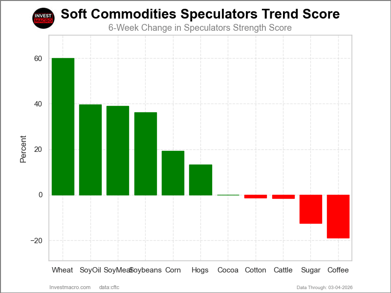 Coffee (-19 percent) leads the downside trend scores currently with Sugar (-13 percent) following next with a lower trend score.