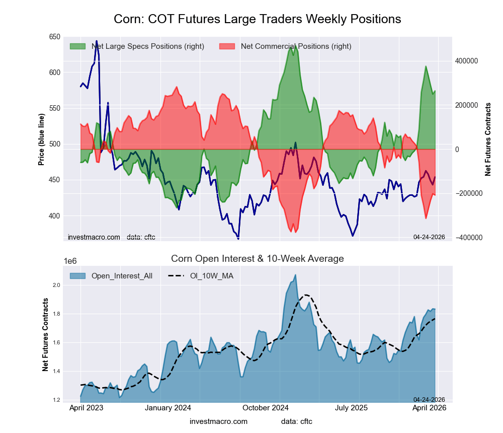 - CORN large speculator standing this week was a net position of 263,732 contracts in the data reported through Tuesday.