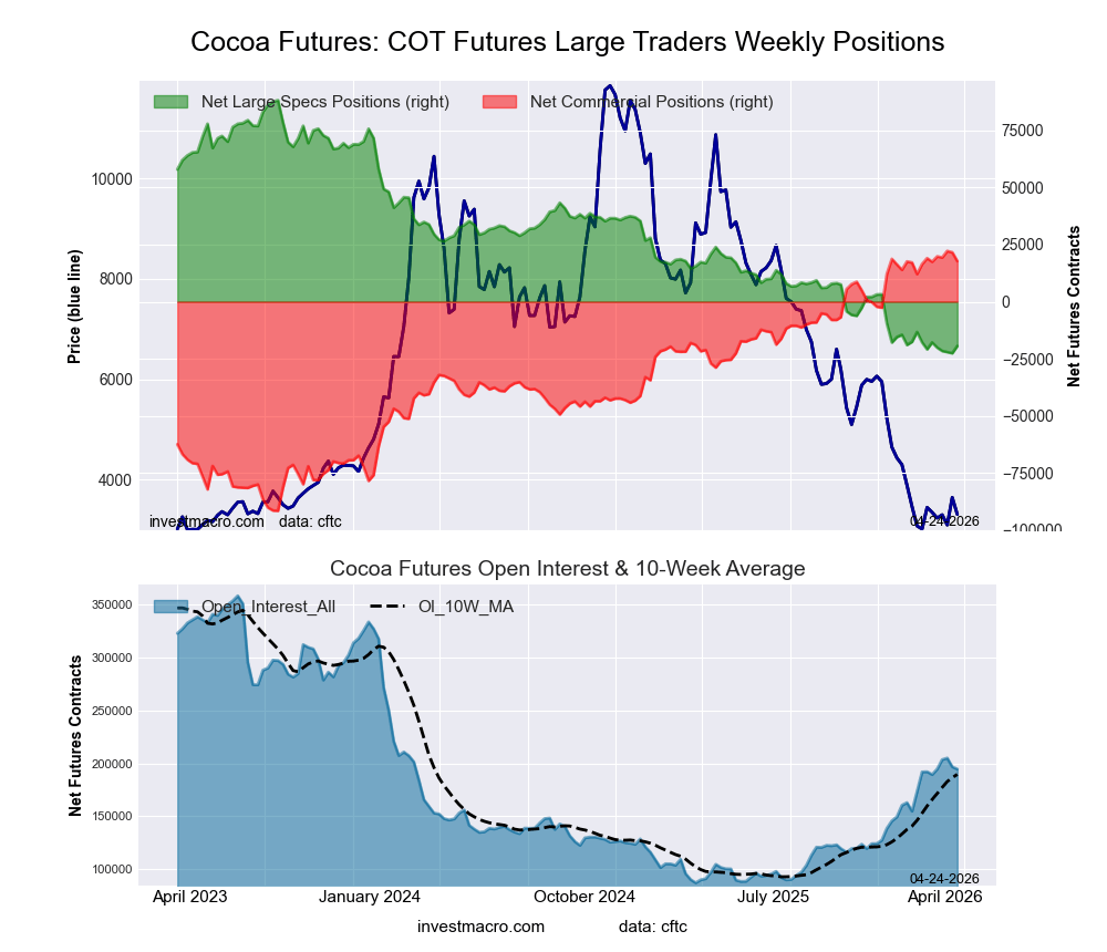 - COCOA large speculator standing this week was a net position of -19,423 contracts in the data reported through Tuesday.