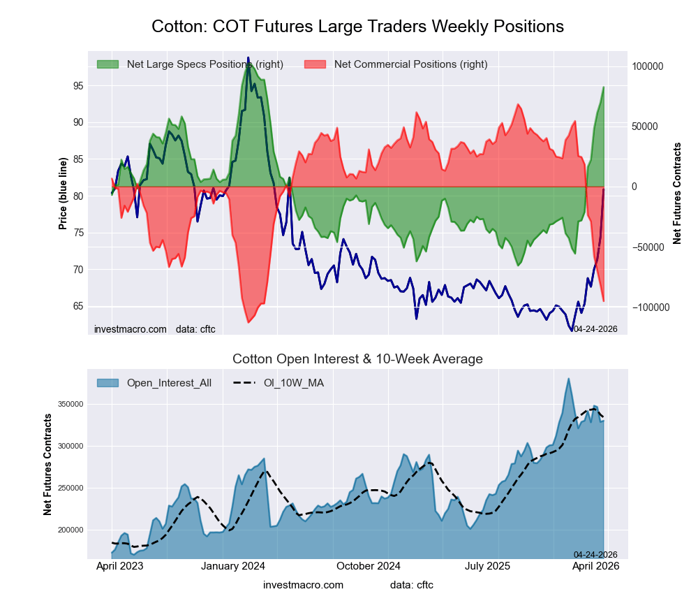 - COTTON large speculator standing this week was a net position of 82,567 contracts in the data reported through Tuesday.