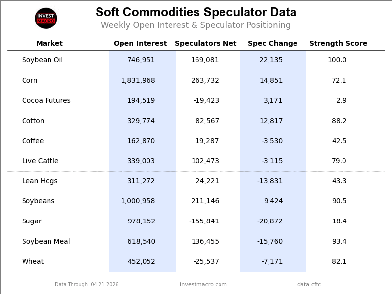 - COT Soft Commodities Charts: SoyOil lead Speculator Bets Apr 26, 2026
