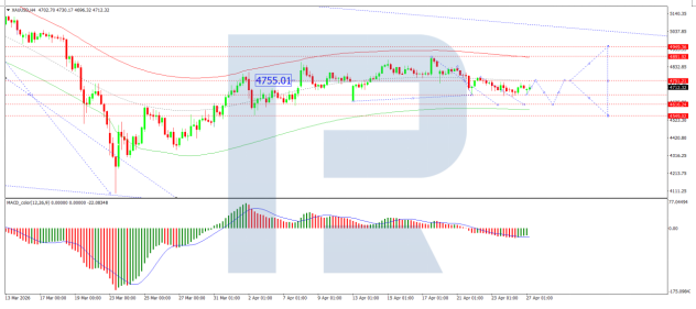 On the H4 XAU/USD chart, gold is trading within a consolidation range around the 4,690 USD level. An upside breakout could push prices towards 4,751 USD, while a downside break could lead to a move lower towards 4,616 USD. The MACD indicator confirms the current downside momentum, with its signal line below the centre line and pointing firmly downwards.