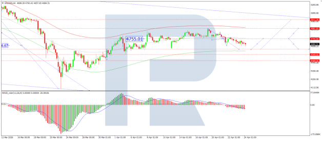 On the H4 XAU/USD chart, gold is trading within a consolidation range around the 4,685 USD level. An upside breakout could push prices towards 4,755 USD, while a downside break could lead to a decline towards 4,616 USD. The MACD indicator confirms the current downside momentum, with its signal line below the centre line and pointing firmly downwards.