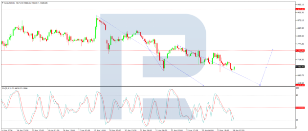 On the H1 chart, gold has broken below the 4,693 USD level and continues to move lower towards 4,616 USD. A corrective rebound towards 4,750 USD (testing from below) is likely, followed by a possible decline to 4,690 USD. The Stochastic oscillator supports this scenario, with its signal line below 50 and pointing firmly downwards towards 20.
