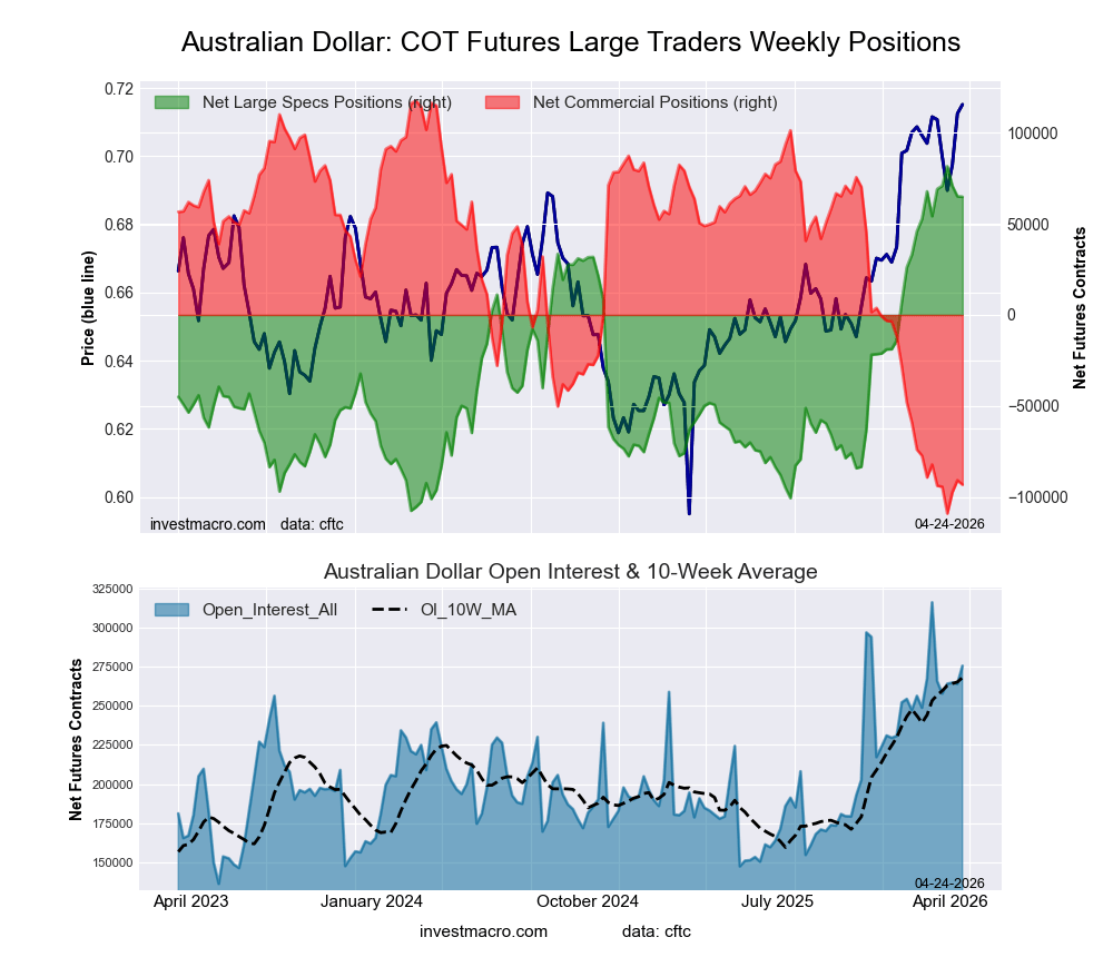 The Australian Dollar remains the most bullish of the speculator positioning of the Currencies currently. The AUD strength score (which is a score of today’s position compared to the past 3-years range) sits at an Extreme-Bullish reading at 91.2%. However, the Australian Dollar speculator position has been weakening a bit recently and this week fell for a third consecutive week. The overall net position is at its lowest level of the past six weeks at a total net position of 64,817 contracts but remains above the 2026 (so far) weekly average of 41,083 contracts. In the Foreign Exchange markets, the Australian Dollar has continued to show its strength as it trades currently at 0.7146. The Aussie has gained for four consecutive weeks and remains near the top of its range and best trading levels since June 2022 (vs the USD).