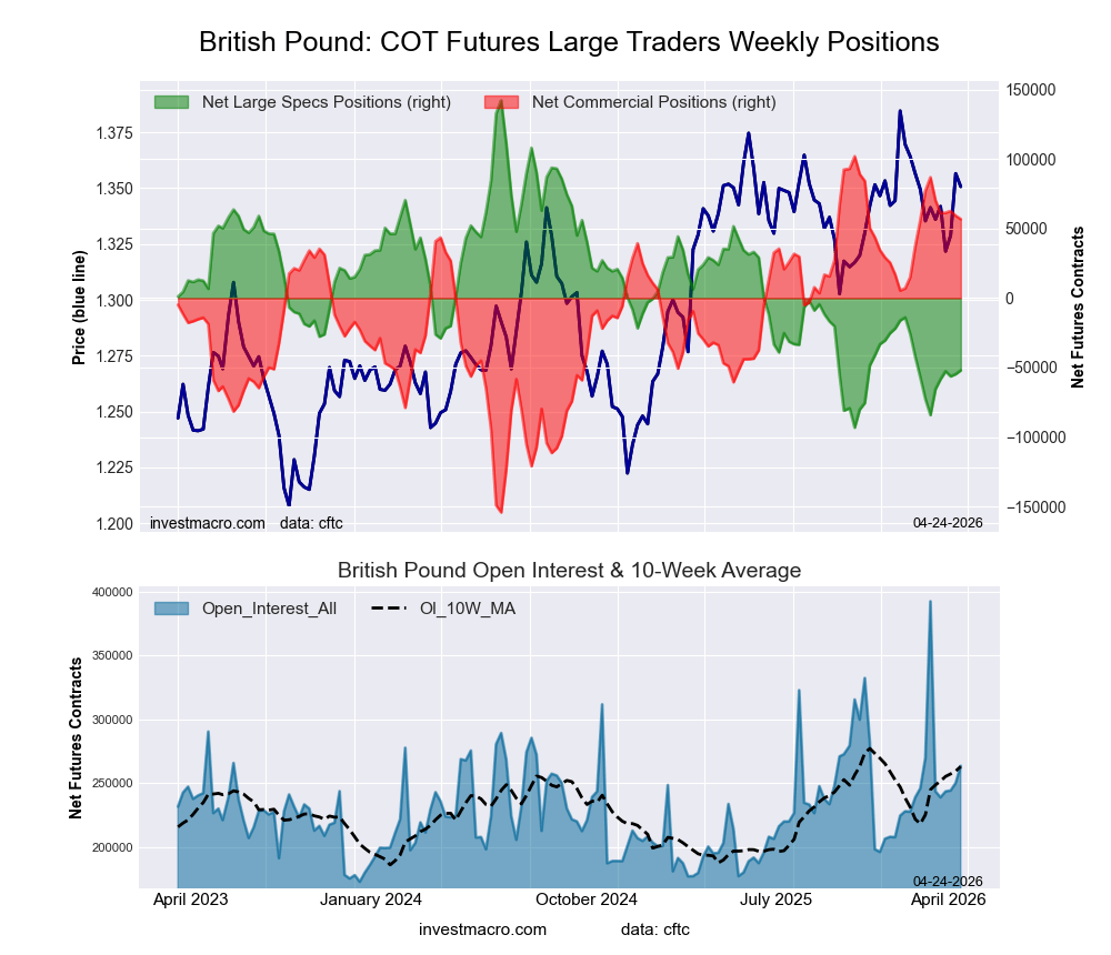 The Euro speculator positioning this week jumped by over 15,000 contracts and follows up last week’s strong gain of over 33,000 contracts. These two weeks of strong gains have brought the overall net standing for the Euro back into bullish territory after spending one week (on April 7) in bearish territory. Previously, the Euro was consistently sitting in strong bullish territory for a time-frame from March 2025 until March 2026, with most weeks above +100,000 contracts. Since March 10th, the Euro positioning took a deep dive and culminated in a negative position on April 7 at -7,541 contracts. With a couple of strong weeks, the position is back above +41,324 contracts this week. In the Foreign Exchange market, the Euro continues to trade within its band of recent action between 1.1500 on the downside for support and 1.1900 on the upside, providing resistance. This week, the Euro fell modestly after three straight weeks of gains and closed out the week at 1.1745 against the US Dollar.