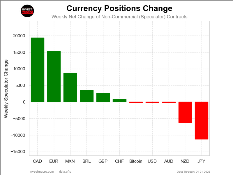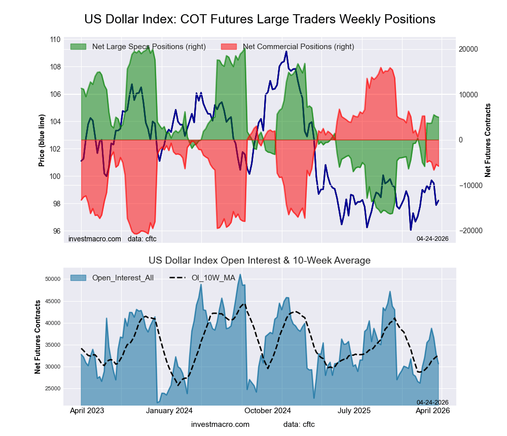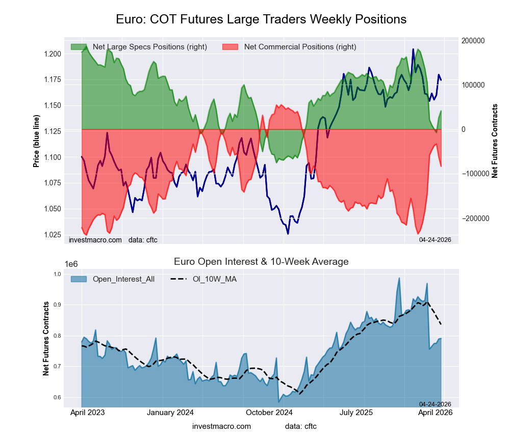 The latest COT data is updated through Tuesday April 21st and shows a quick view of how large market participants (for-profit speculators and commercial traders) were positioned in the futures markets. All currency positions are in direct relation to the US Dollar where, for example, a bet for the Euro is a bet that the Euro will rise versus the Dollar while a bet against the Euro will be a bet that the Euro will decline versus the Dollar.