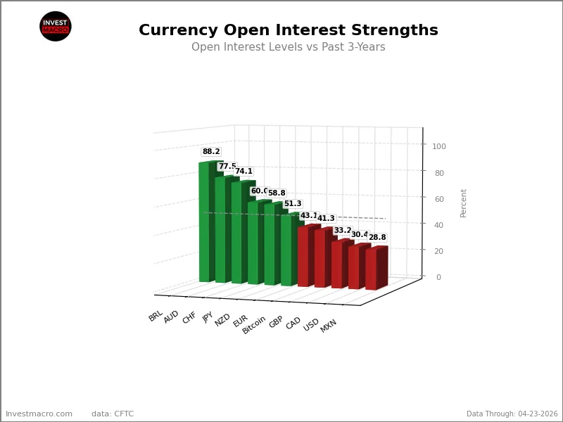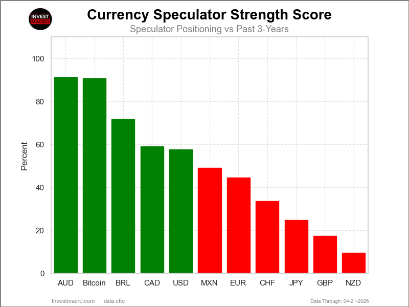 COT Strength Scores (a normalized measure of Speculator positions over a 3-Year range, from 0 to 100 where above 80 is Extreme-Bullish and below 20 is Extreme-Bearish) showed that the Australian Dollar (91 percent) and Bitcoin (91 percent) lead the currency markets this week. The Brazilian Real (72 percent), Canadian Dollar (59 percent) and the US Dollar Index (58 percent) come in as the next highest in the weekly strength scores.