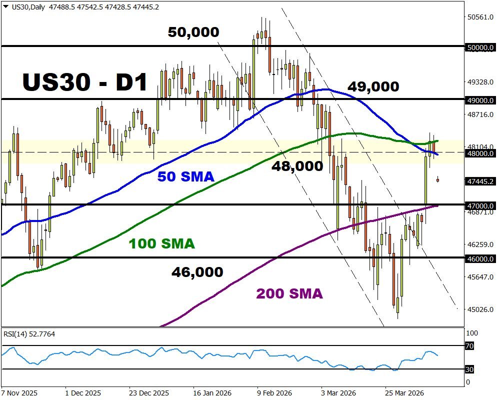 BEARISH: Weakness below 48,000 could see a move toward the 200-day SMA at 47,000 and 46,000.
