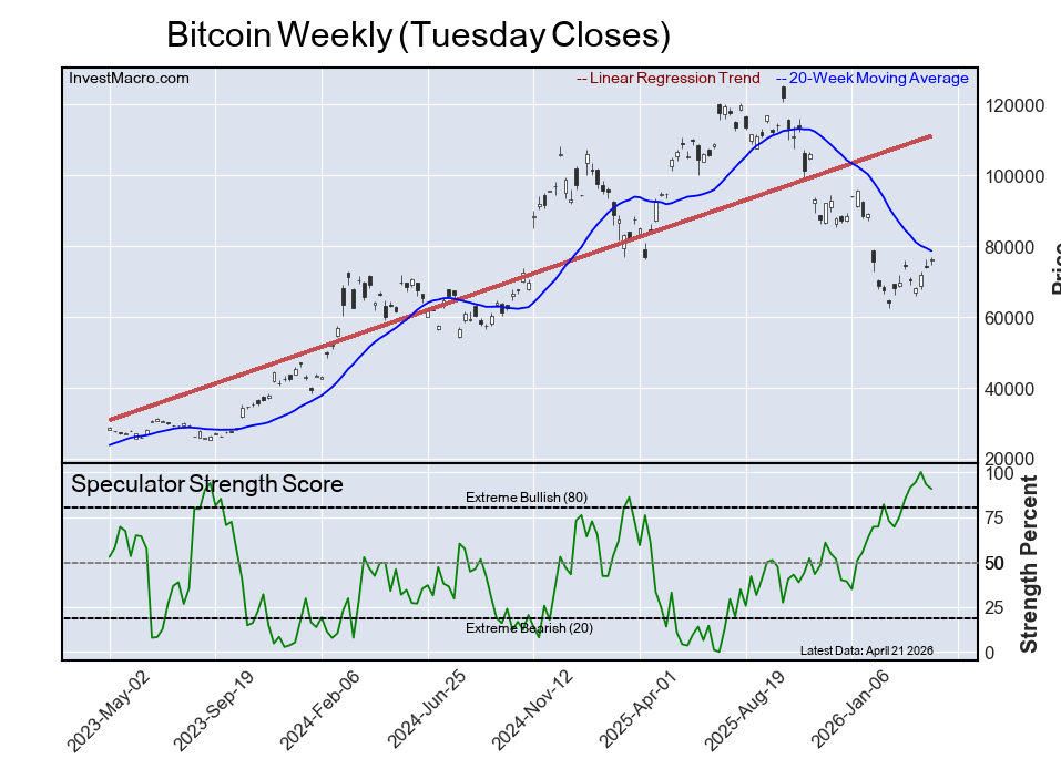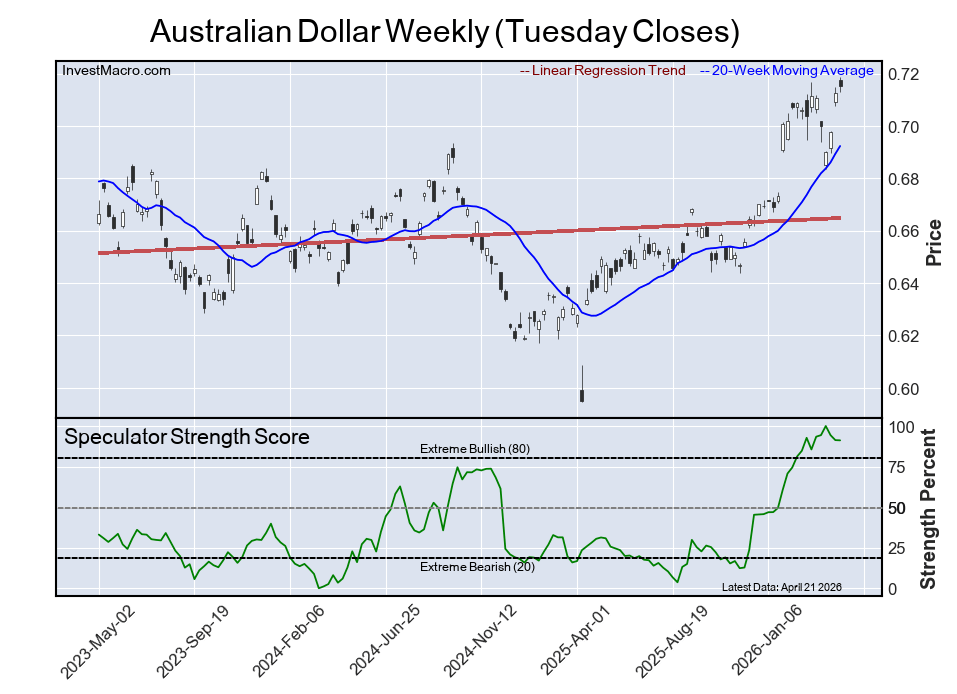 The six-week trend for the speculator strength score was a boost of 10 percentage points this week while the speculator position was -155,841 net contracts this week with a drop of -20,872 contracts in the weekly speculator bets.
