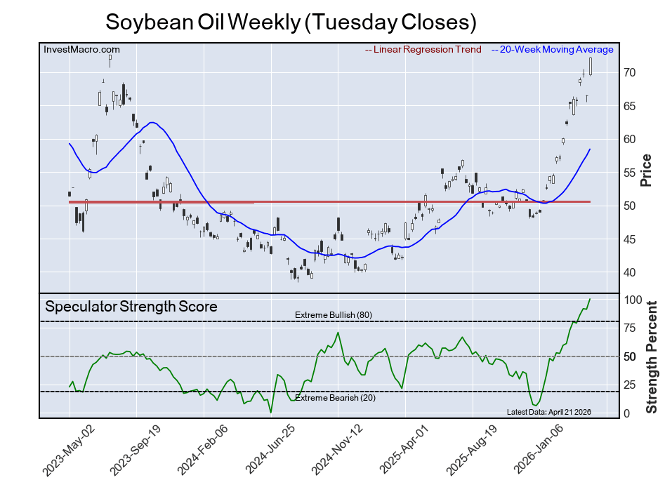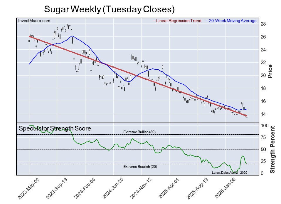 The six-week trend for the speculator strength score was a boost of 1 percentage points this week while the speculator position was -19,423 net contracts this week with a gain of 3,171 contracts in the weekly speculator bets.