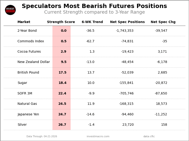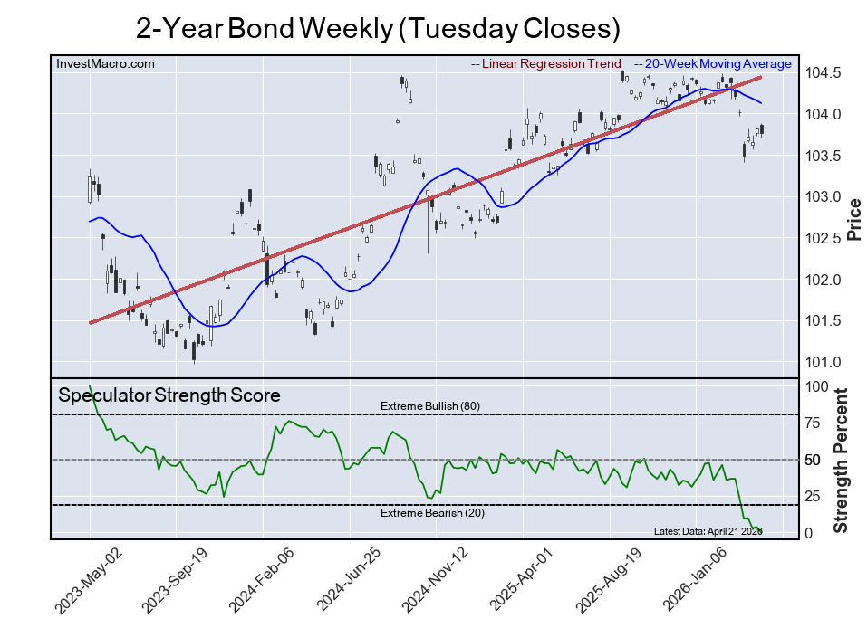 The 2-Year Bond speculator position comes in as the most bearish extreme standing this week with the 2-Year speculator level at a minimum 0 percent score of its 3-year range.