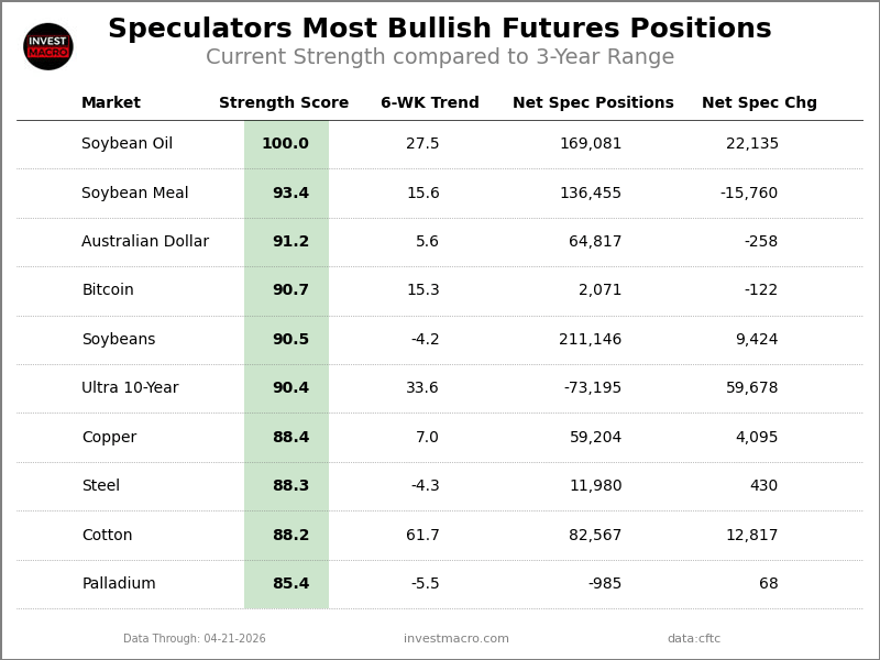 The latest update for the weekly Commitment of Traders (COT) report was released by the Commodity Futures Trading Commission (CFTC) on Friday for data ending on Tuesday April 21st.