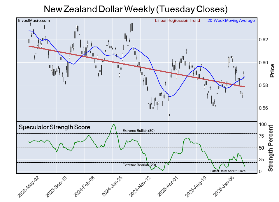 The New Zealand Dollar speculator position comes in as third most bearish standing of the week. The NZD speculator level resides at a 10 percent score of its 3-year range and the six-week trend for the speculator strength score was a decline of -13 percentage points this week.