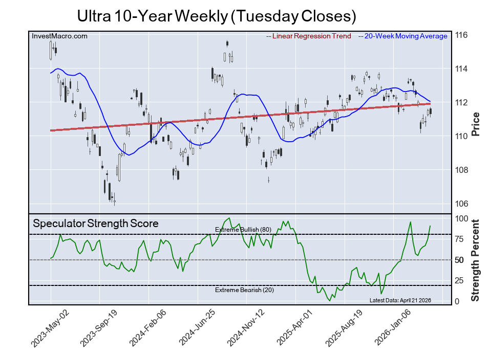 The Ultra 10-Year speculator position rounds out the top five in this week’s bullish extreme standings. The Ultra 10-Year speculator level sits at a 90 percent score of its 3-year range and the six-week trend for the speculator strength score was a rise higher by 34 percentage points this week.