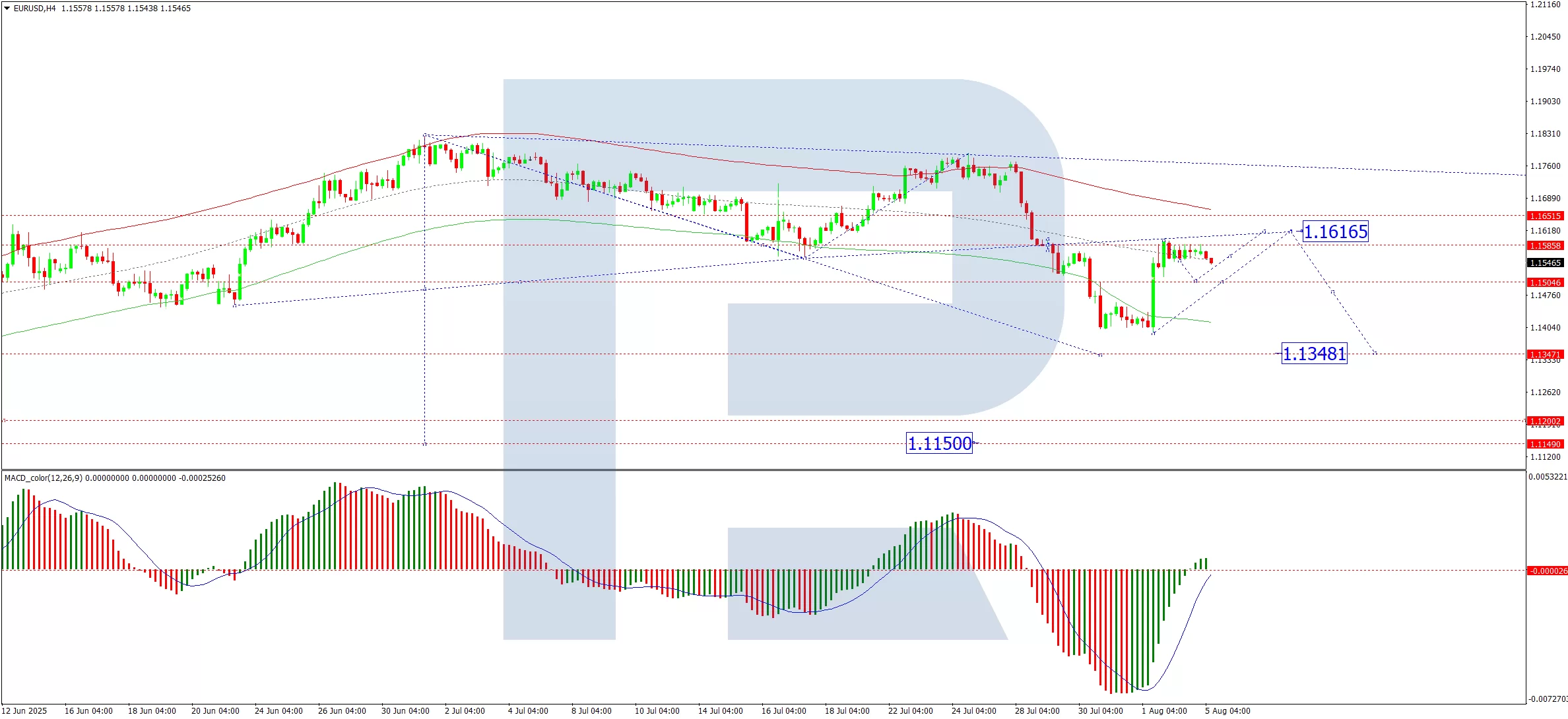 The EUR/USD corrected to 1.1590 before entering consolidation below this level. A breakout towards 1.1615 remains possible, but the primary expectation is a resumption of the downtrend, targeting 1.1348 as the next key support. This bearish view is supported by the MACD indicator, with its signal line firmly below zero and pointing downward.