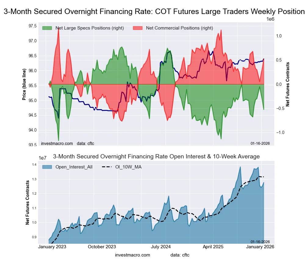The Secured Overnight Financing Rate (3-Month) large speculator standing this week resulted in a net position of -594,042 contracts in the data reported through Tuesday. This was a weekly boost of 1,559 contracts from the previous week which had a total of -595,601 net contracts.