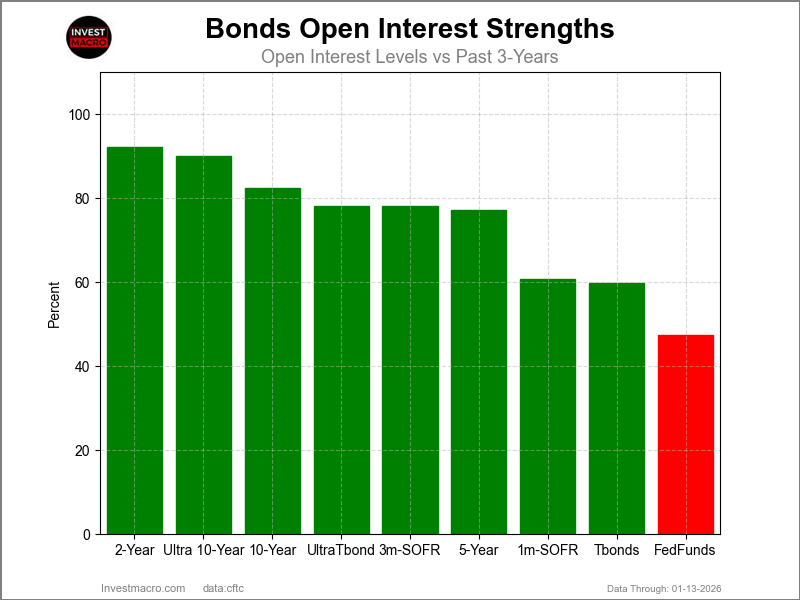 On the downside, the 2-Year Bond (26.2 percent), the 5-Year Bonds (28 percent) and the SOFR 3-Months (30 percent) come in at the lowest strength levels currently.