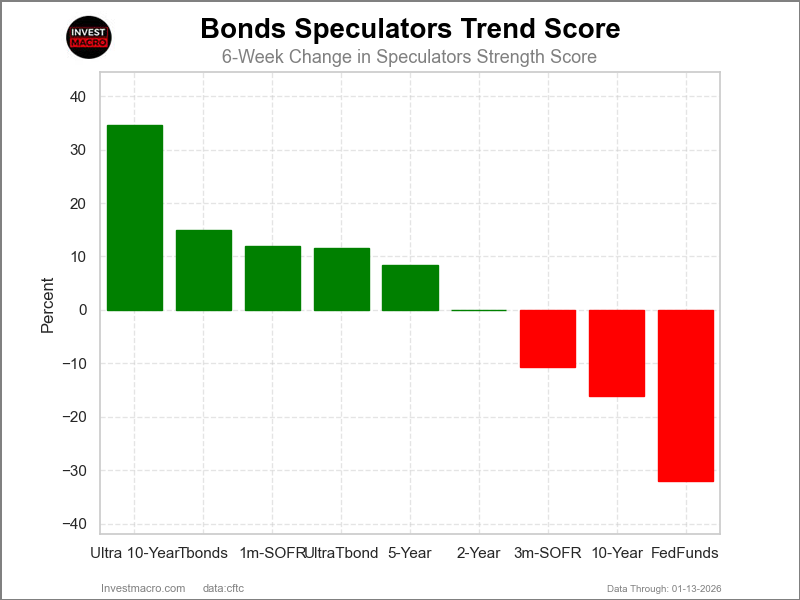 COT Strength Score Trends (or move index, calculates the 6-week changes in strength scores) showed that the SOFR 1-Month (41 percent) and the Ultra 10-Year Bonds (17 percent) lead the past six weeks trends for bonds. The US Treasury Bond (13 percent) and the 2-Year Bonds (13 percent) are the next highest positive movers in the latest trends data.