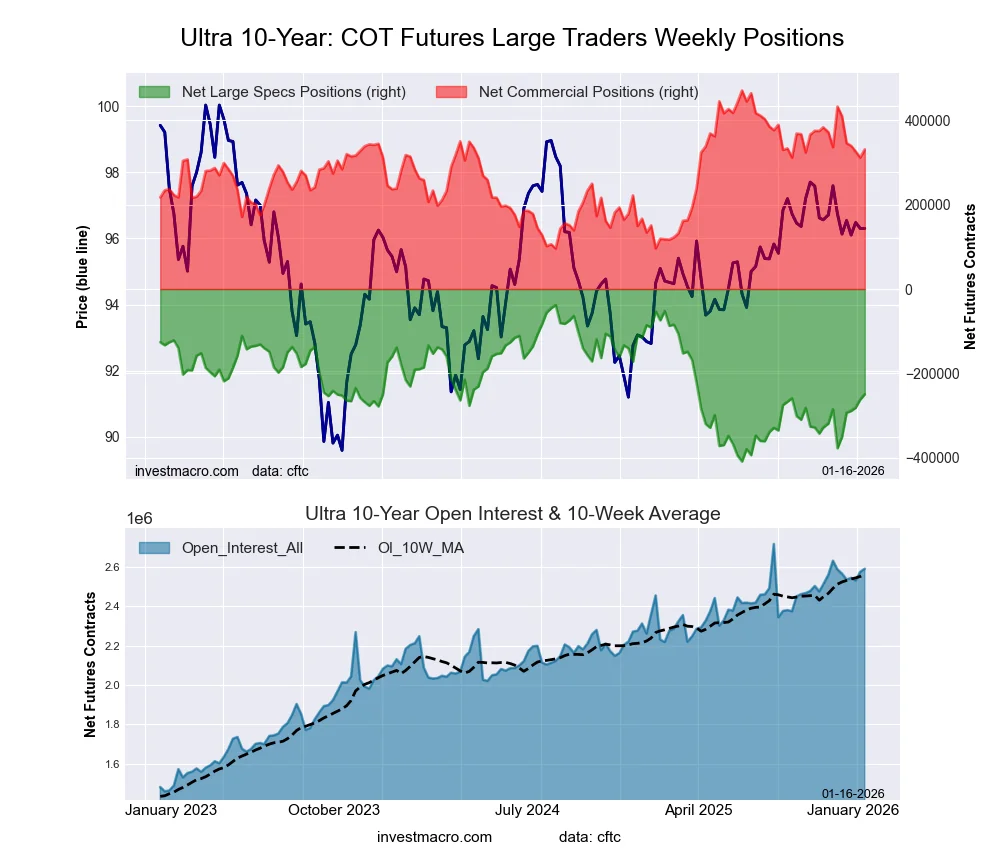The Ultra 10-Year Notes large speculator standing this week resulted in a net position of -229,874 contracts in the data reported through Tuesday. This was a weekly increase of 5,408 contracts from the previous week which had a total of -235,282 net contracts.