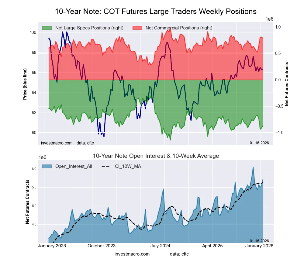 The 10-Year Treasury Note large speculator standing this week resulted in a net position of -726,151 contracts in the data reported through Tuesday. This was a weekly decrease of -70,511 contracts from the previous week which had a total of -655,640 net contracts.