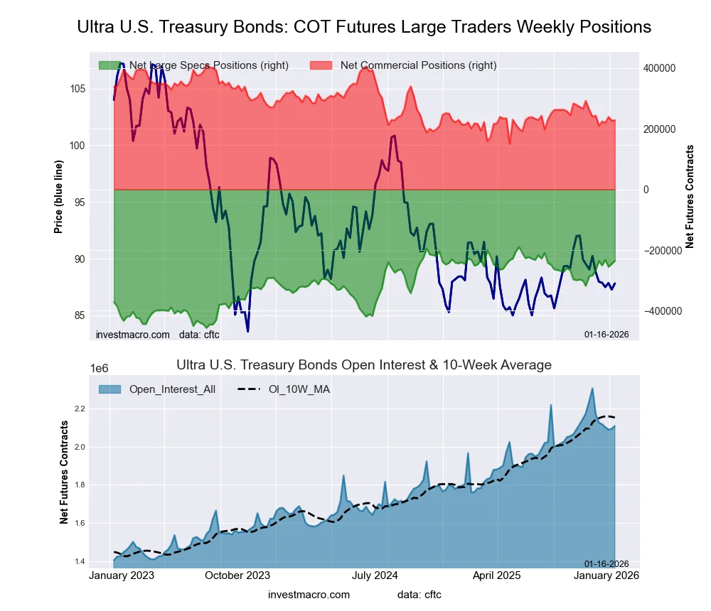 The Ultra US Treasury Bonds large speculator standing this week resulted in a net position of -273,471 contracts in the data reported through Tuesday. This was a weekly decrease of -14,649 contracts from the previous week which had a total of -258,822 net contracts.