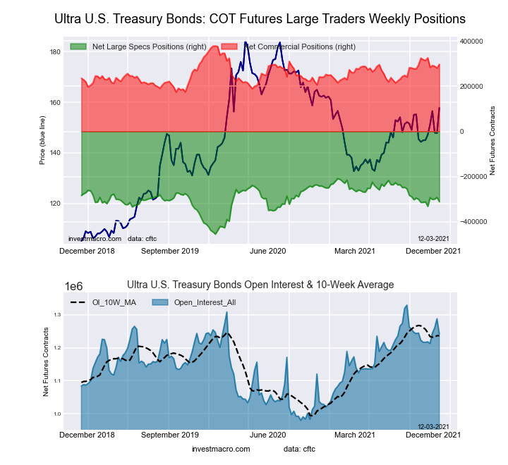 The Ultra 10-Year Notes large speculator standing this week recorded a net position of 113,816 contracts in the data reported through Tuesday. This was a weekly lift of 2,904 contracts from the previous week which had a total of 110,912 net contracts.