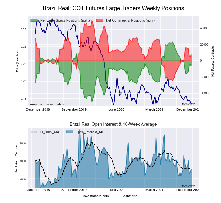 The Brazilian Real large speculator standing this week resulted in a net position of -10,812 contracts in the data reported through Tuesday. This was a weekly decrease of -9,736 contracts from the previous week which had a total of -1,076 net contracts.