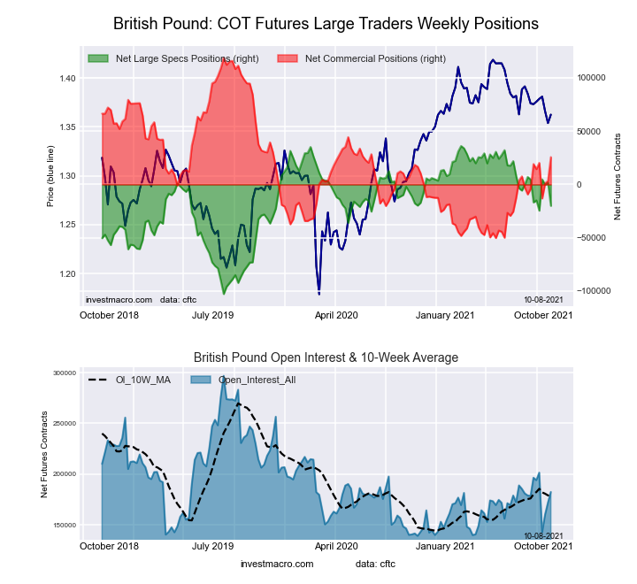 The British Pound Sterling large speculator standing this week resulted in a net position of -11,979 contracts in the data reported through Tuesday. This was a weekly increase of 8,039 contracts from the previous week which had a total of -20,018 net contracts.