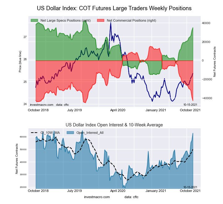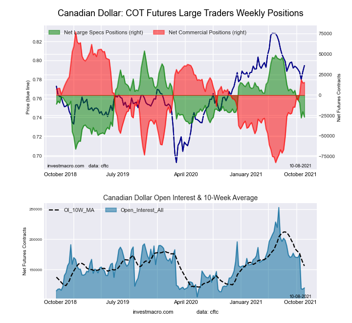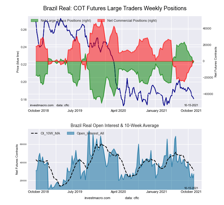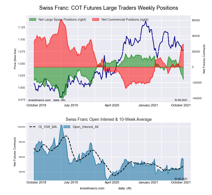 The latest COT data is updated through Tuesday October 12th 2021 and shows a quick view of how large traders (for-profit speculators and commercial entities) were positioned in the futures markets. All currency positions are in direct relation to the US dollar where, for example, a bet for the euro is a bet that the euro will rise versus the dollar while a bet against the euro will be a bet that the euro will decline versus the dollar.