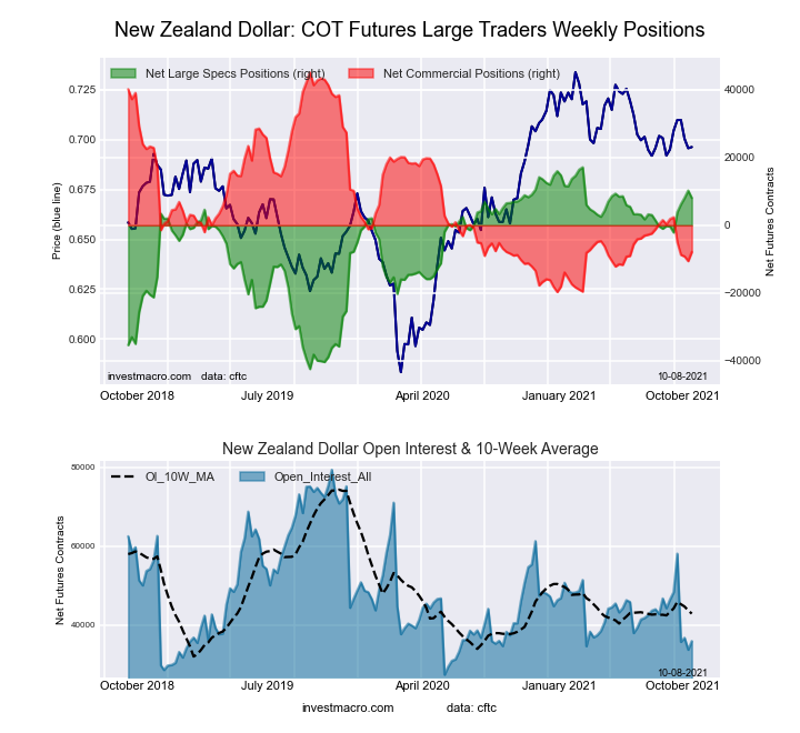 The New Zealand Dollar large speculator standing this week resulted in a net position of 8,748 contracts in the data reported through Tuesday. This was a weekly gain of 692 contracts from the previous week which had a total of 8,056 net contracts.