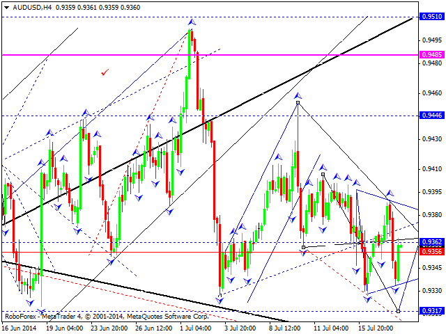 Australian Dollar is still moving downwards; this movement may be considered as a part of descending wave towards level of 0.9320. Later, in our opinion, instrument may return to level of 0.9360 and then form another descending structure to reach level of 0.9270.
