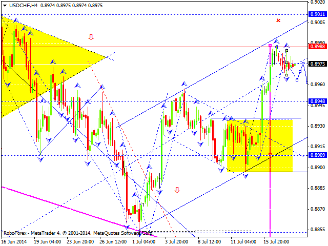 Franc is forming consolidation channel, which may be considered as reversal pattern. We think, today price may continue falling down towards next target at level of 0.8830.