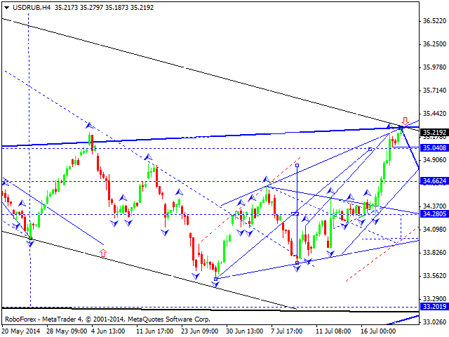 Ruble continued extending its ascending structure and reached target of correctional wave. We think, today price may consolidate for a while at current highs; this consolidation may be considered as reversal pattern. Later, in our opinion, instrument may leave its ascending channel and form the fifth descending wave towards level of 33.20.