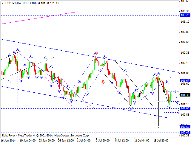 Yen continues moving inside its third descending wave towards level of 99.30. We think, today price may form another structure with target at level of 100.50.