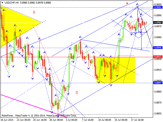Franc continues consolidating. We think, today price may leave this consolidation channel downwards and reach level of 0.8950. This movement may be considered as part of another descending wave with target at level of 0.8830.
