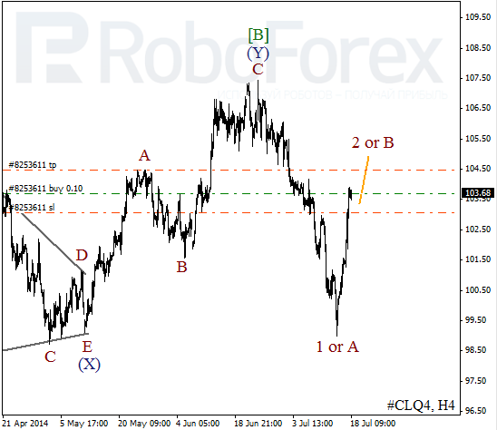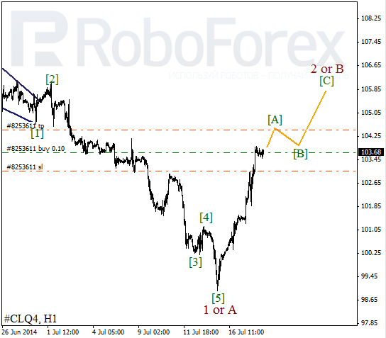 Oil is still being corrected quite fast. In the near term, price is expected to continue growing up inside wave 2 or B, that’s why I decided to open short-term buy order during local correction.