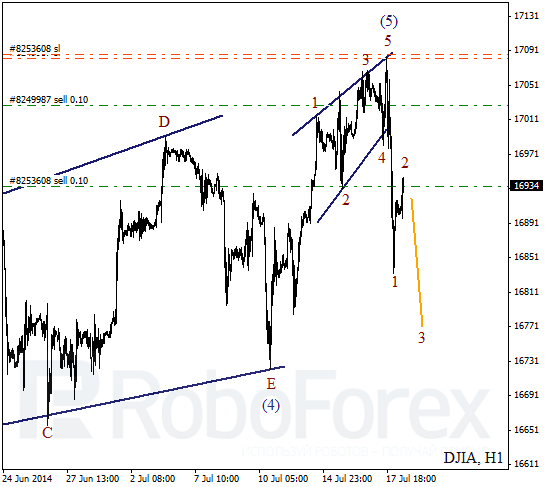 More detailed wave structure is shown on H1 chart. Probably, price formed diagonal triangle pattern inside wave (5). On minor wave level, Index completed impulse inside wave 1. After finishing the second wave, instrument is expected to start new descending movement inside the third one.